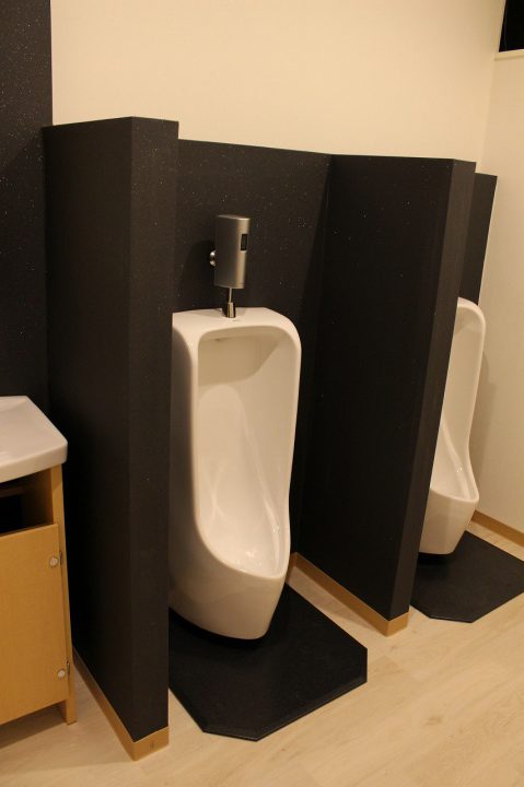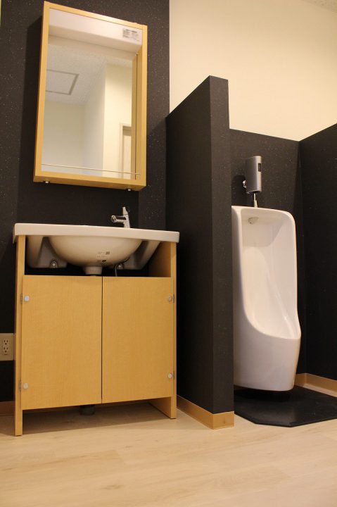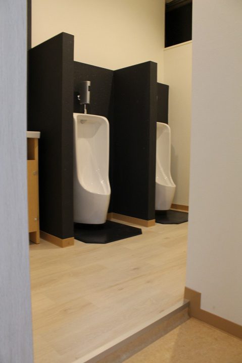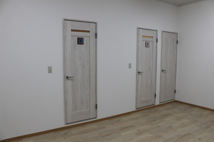 既存トイレでは男性、女性の区別がありませんでした。(同室)そこで綺麗にしたい、男性、女性を分けたいとの要望が、あり既存のスペースの中でレイアウトをしながら、男性、女性トイレを区画して別々に改修しました。その周辺の 給湯室や更衣室、トイレ前室もきれいに改修しました。